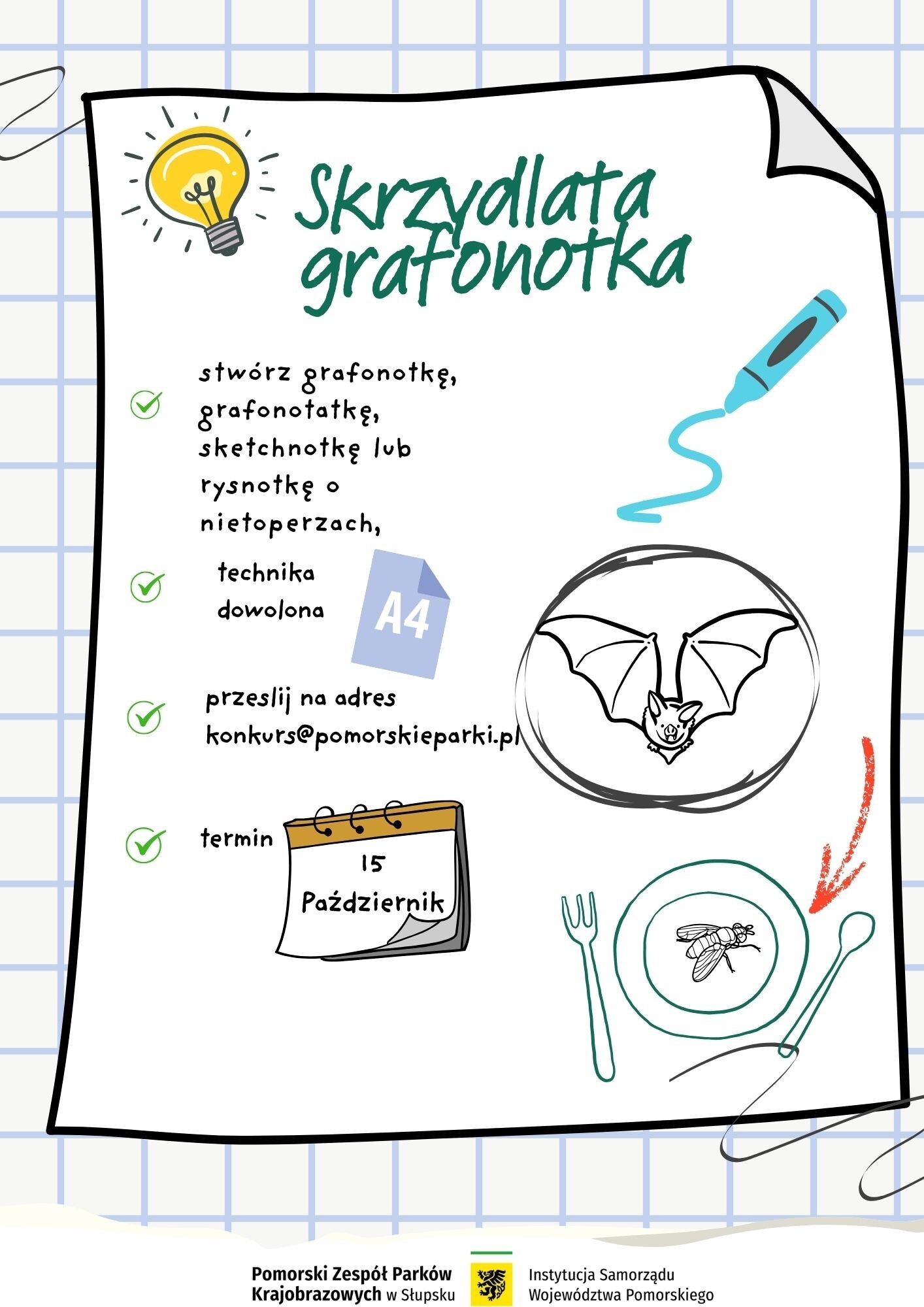 Konkurs „Skrzydlata grafonotka” skierowany jest do uczniów klas I–VI i ma na celu twórcze połączenie wiedzy przyrodniczej z kreatywną formą jej przedstawienia. Zadaniem uczestników jest stworzenie notatki wizualnej (grafonotki, rysnotki, sketchnotki) poświęconej życiu nietoperzy.